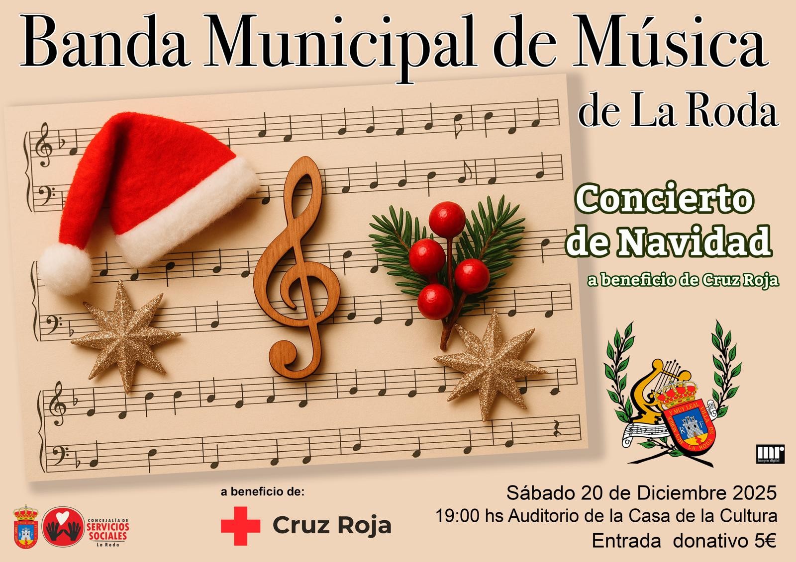 La Banda Municipal de Música de La Roda, en colaboración con el Ayuntamiento, realizará el próximo sábado, 20 de diciembre, su tradicional concierto de Navidad, que tendrá un carácter solidario, ya que la recaudación irá un año más destinada íntegramente a Cruz Roja, entidad que desarrolla una importante labor social en la localidad y en el conjunto de la provincia