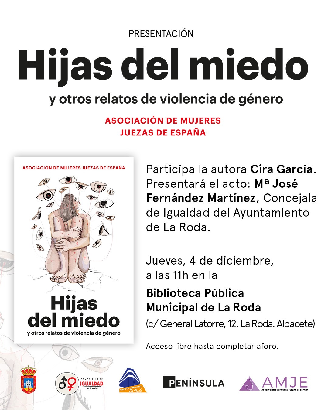 El 4 de diciembre la Biblioteca Municipal acoge la presentación del libro ‘Hijas del miedo y otros relatos de violencia de género’, de la Asociación de Mujeres Juezas de España. La cita contará con la presencia de la magistrada Cira García Domínguez, antigua jueza de Violencia de Género de Albacete y actual titular en Getafe, reconocida por su labor en la defensa de los derechos de las mujeres
