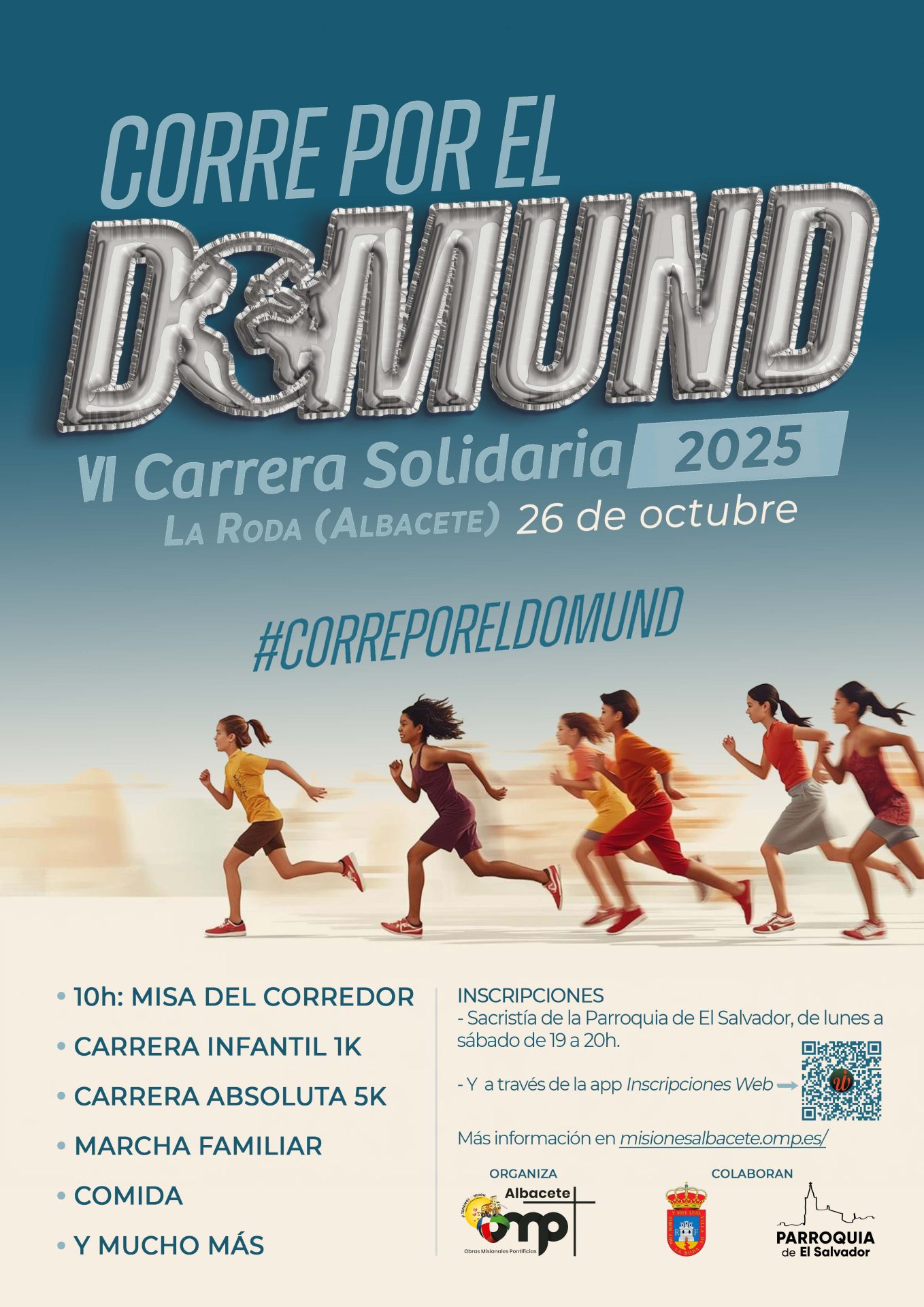 La Roda celebrará el próximo domingo, 26 de octubre, una nueva edición de la Carrera Solidaria ‘Corre por el Domund’, organizada por las Obras Misionales Pontificias (OMP) con la colaboración del Ayuntamiento de La Roda y la Parroquias de La Roda. Habrá carreras, comida en la Caja Blanca y mucho más. Ya se pueden adquirir los dorsales y las camisetas