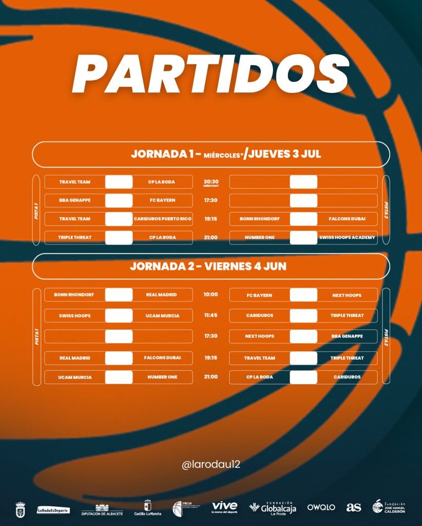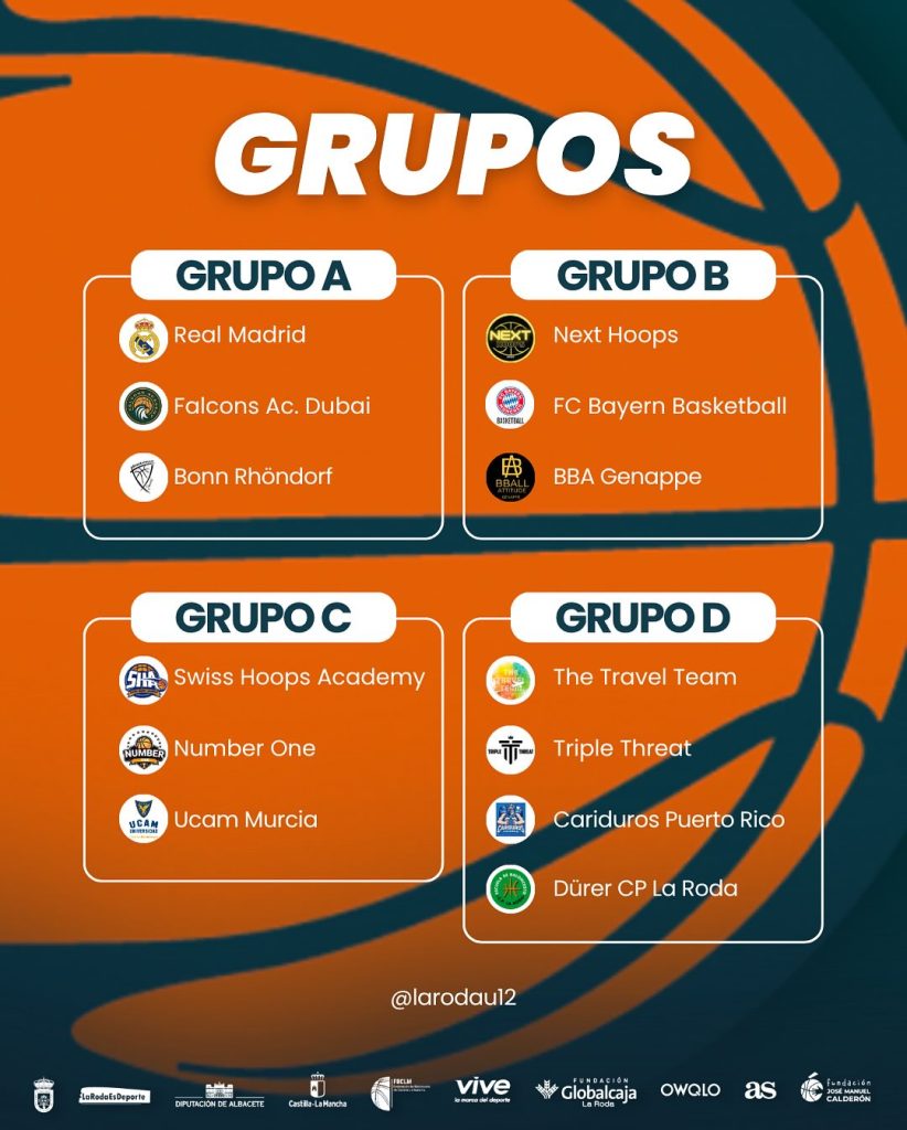En concreto, Real Madrid, Falcons AC. Dubai Basketball (Emiratos Árabes), Team Bonn Rhöndorf Juniors (Alemania), Next Hoops, FC Bayern Basketaball (Alemania), BBA Genappe (Bélgica), Swiss Hoops AC (España), AC. Number One (Francia), UCAM Murcia CB, la selección europea The Travel Team, Triple Threat (Países Bajos), Cariduros (Puerto Rico) y el equipo local Dürer CP La Roda.