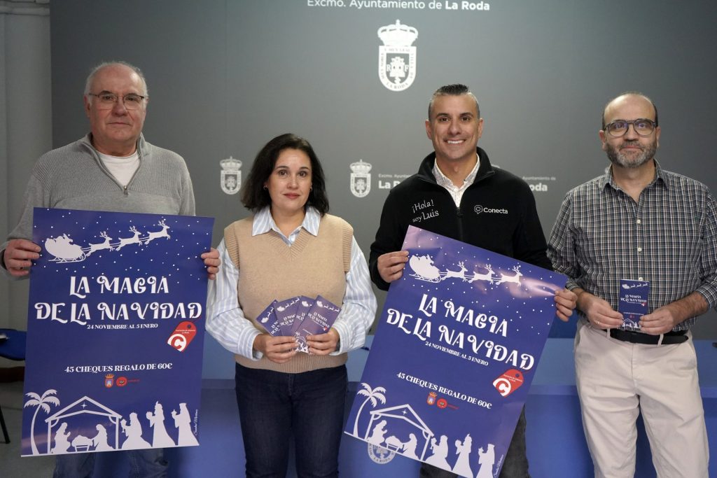 La Asociación de Comercio de La Roda, en colaboración con el Ayuntamiento, ha presentado la campaña navideña “La Magia de la Navidad”, una iniciativa que estará activa hasta el 5 de enero de 2026y que busca incentivar las compras en el comercio de cercanía durante estas fechas. En la presentación participaron la concejala de Comercio, Mª Ángeles García; el presidente de la Asociación de Comercio, Luis Ponce; el vicepresidente, Isidro Pastor; y el secretario, Eloy Daniel Martínez.