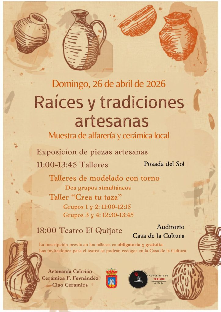 El Ayuntamiento de La Roda celebrará el próximo domingo 26 de abril una nueva edición de las Jornadas de Turismo ‘Raíces y tradiciones artesanas’; una propuesta que tendrá lugar en la Posada del Sol y el Auditorio Municipal y que pretende poner en valor la riqueza del patrimonio artesanal local, con especial atención a la alfarería y la cerámica como señas de identidad del municipio.