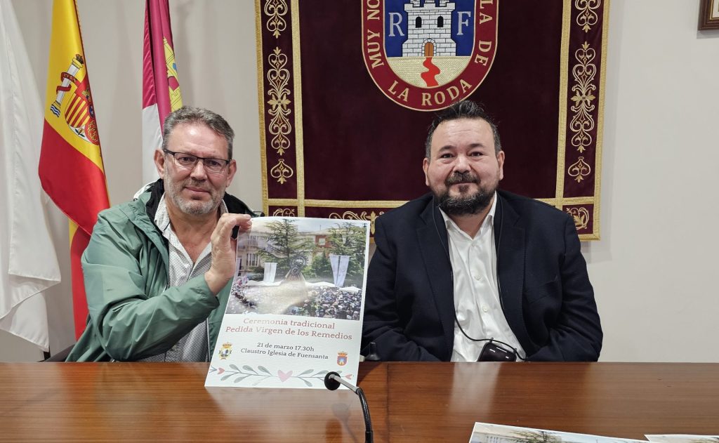 Los alcaldes de La Roda y Fuensanta, Juan Ramón Amores y José Manuel Núñez, han anunciado que la petición oficial de la Virgen de los Remedios, por parte del pueblo de La Roda al municipio vecino, tendrá lugar el próximo viernes, 21 de marzo, a partir de las 17.30 horas, en el claustro de Fuensanta, “si el tiempo lo permite” y si no, “estará preparado el Teatro Cervantes”, también en el interior del claustro de la Iglesia de esta localidad.