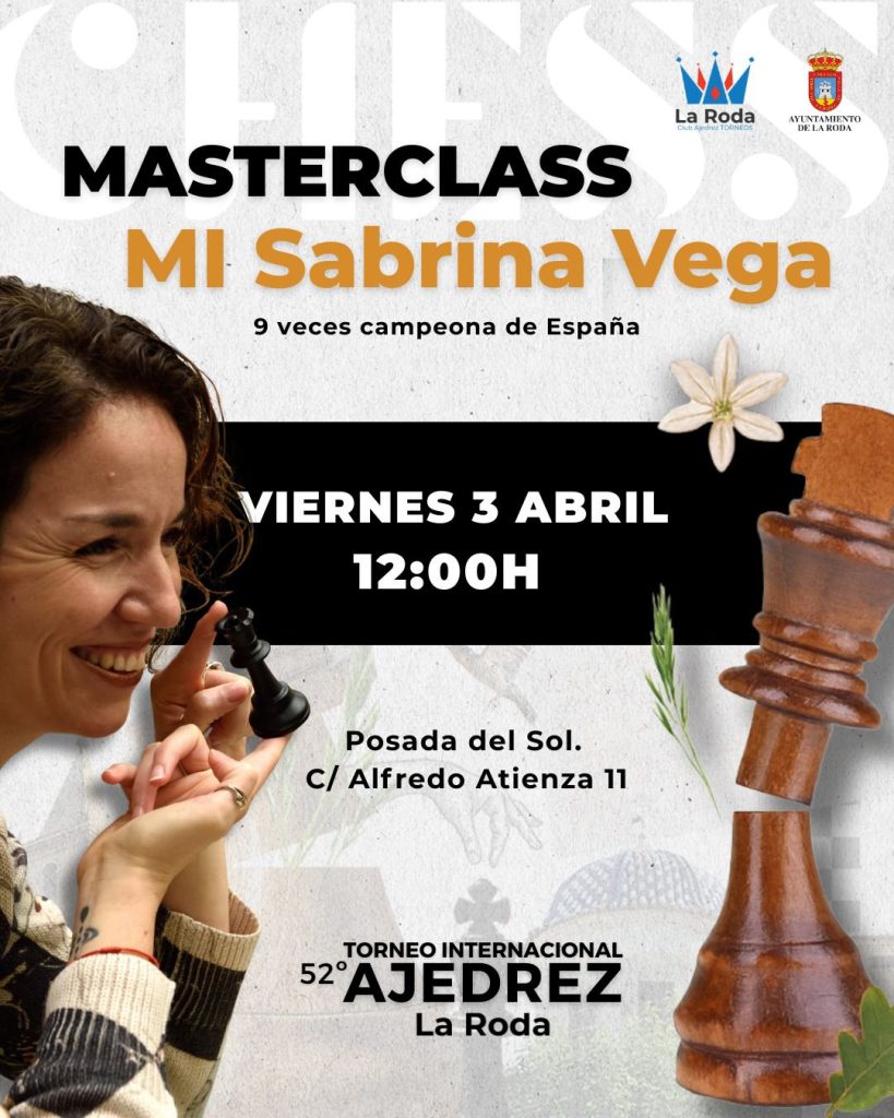 Además, el viernes 3 de abril a las 12:00 horas, la Maestra Internacional Sabrina Vega, nueve veces campeona de España, ofrecerá una masterclass en la Posada del Sol. «Es un gusto escucharla», ha señalado Mario González López, quien ha destacado su participación como uno de los grandes atractivos del torneo.