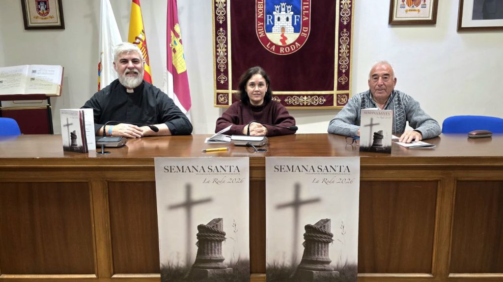 La concejala de Turismo, María Ángeles García, el vicario parroquial de la localidad, José Valtueña, y el presidente de la Junta de Cofradías y Hermandades de la Semana Santa de La Roda, José Antonio Villodre, han presentado el programa oficial de actos y cultos de la Semana Santa rodense 2026, una celebración declarada de Interés Turístico Regional que cada año reúne a cientos de cofrades y visitantes en torno a una de las tradiciones más arraigadas del municipio.