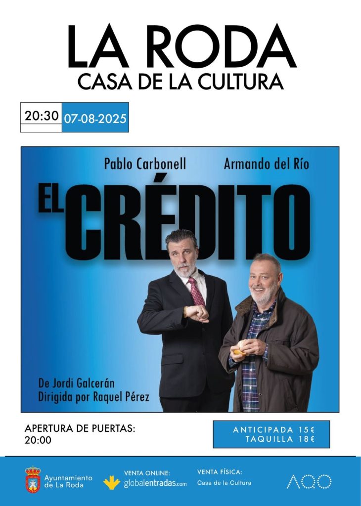 El 7 de agosto, vuelve el “teatro de calidad”, en esta ocasión, ‘El crédito’, con Pablo Carbonell y Armando del Río, una comedia que habla del egoísmo en un marco donde el dinero es el objeto del deseo y a la vez el arma arrojadiza. Será en la Casa de la Cultura a partir de las 20.30 horas.