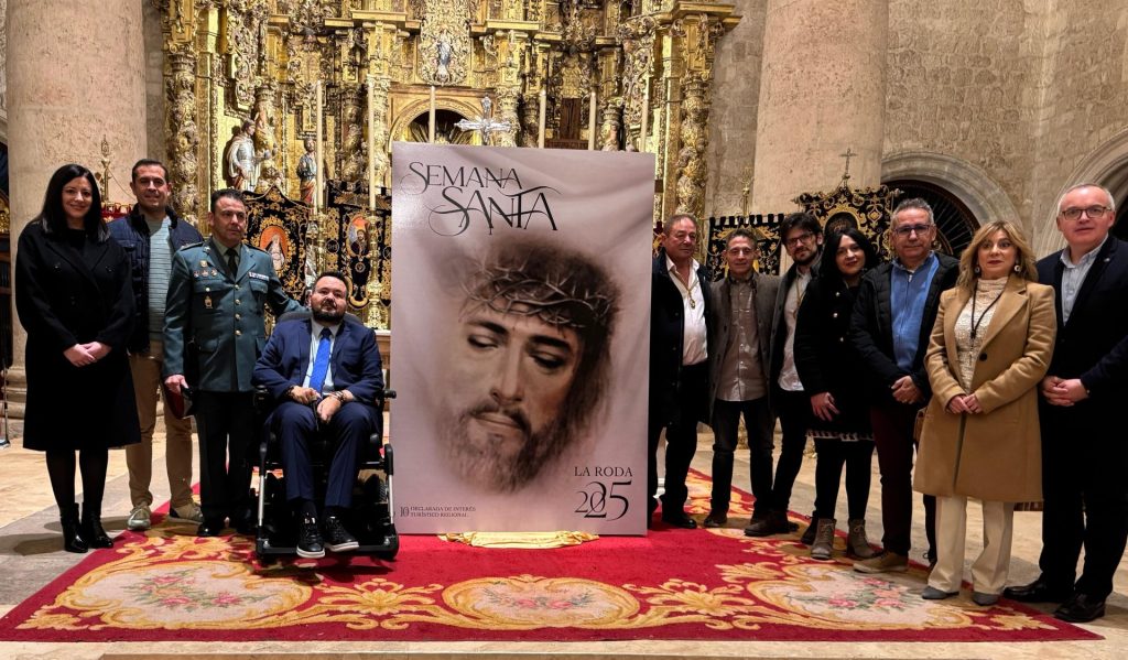 La Iglesia de El Salvador acogía el pasado sábado la presentación oficial del cartel anunciador de la Semana Santa de La Roda de 2025, que este año cumple el décimo aniversario de la Declaración de Fiesta de Interés Turístico Regional y que ha sido obra de Juan Miguel Carrilero Francés, basada en la imagen del paño de Juan Vicente Tébar Fernández.