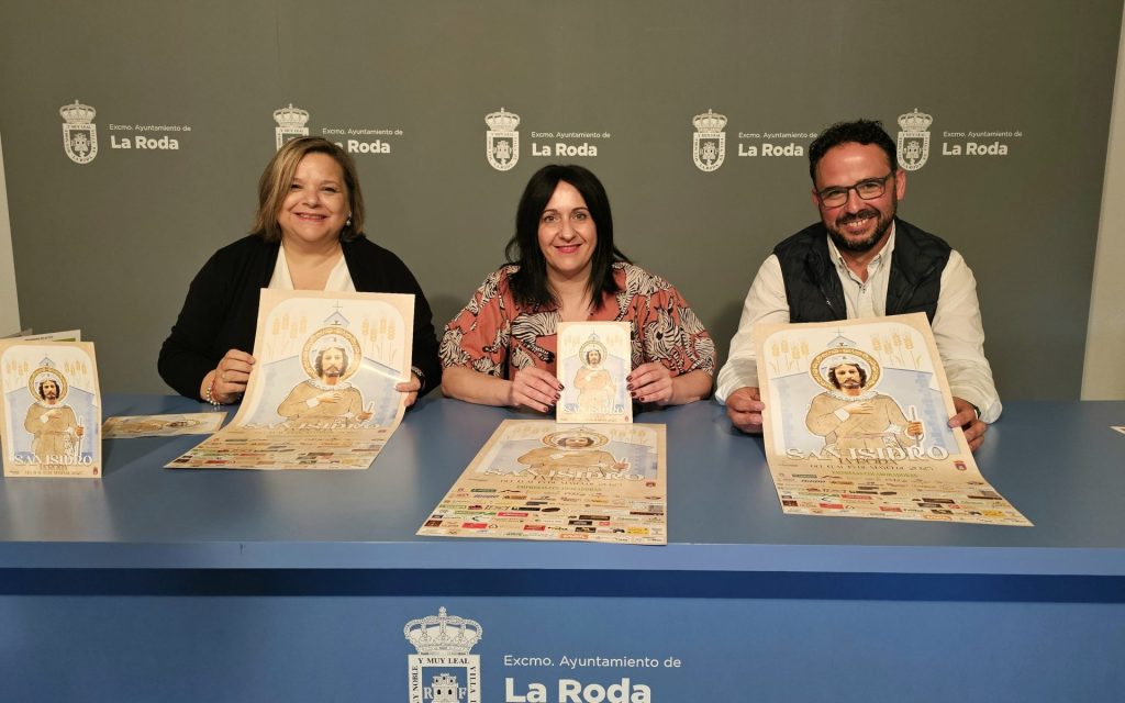La concejala de Medio Ambiente, Ana Estarlich, junto con Juan Francisco Parreño, presidente de la Asociación de Agricultores ‘San Isidro’ de La Roda, y Remedios Fernández, coordinadora de AFA La Roda, han presentado el cartel y el programa de actos en torno a esta festividad que, como año, se celebra el 15 de mayo y que, además, este año es festivo local en el municipio.