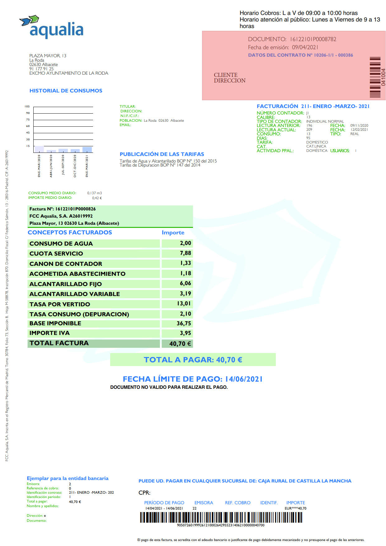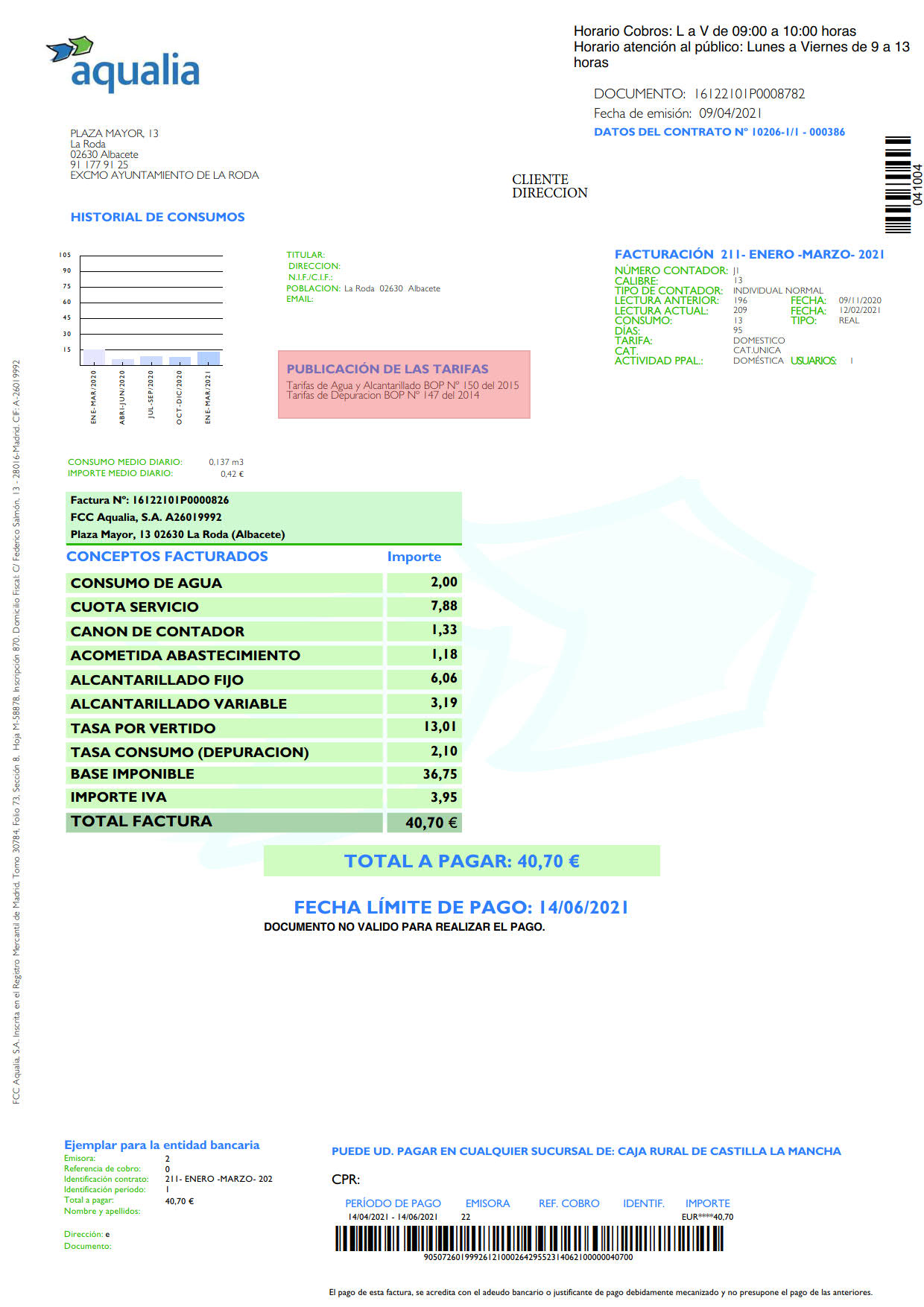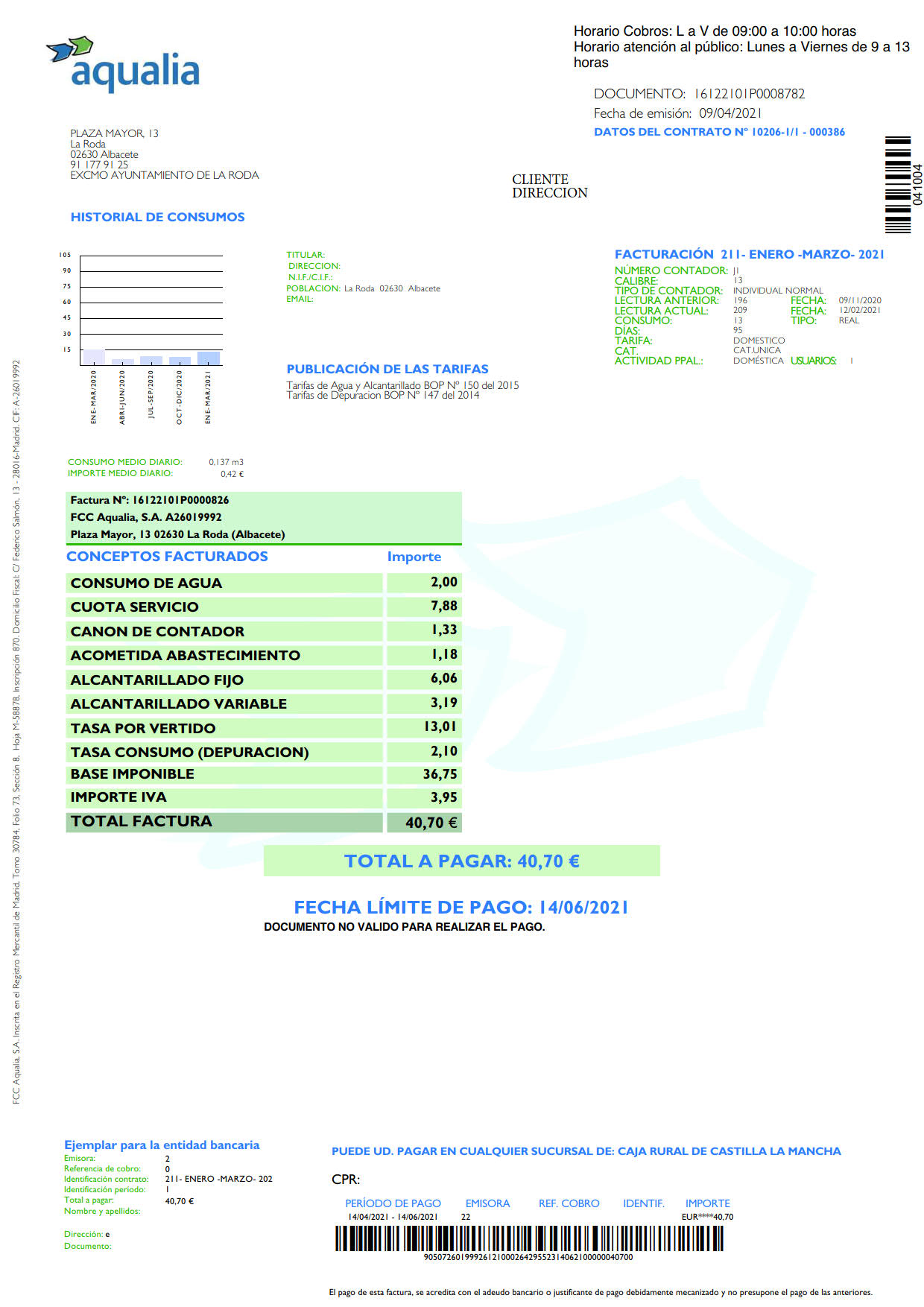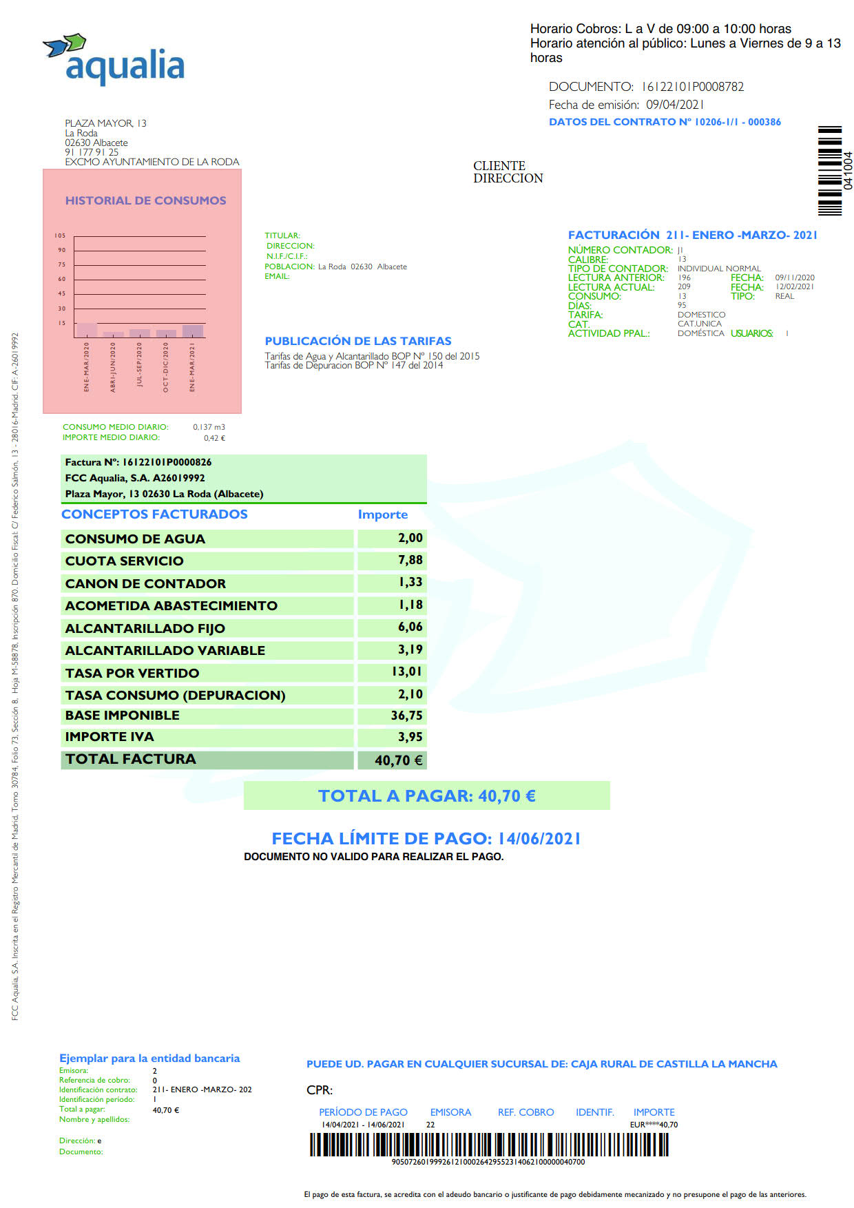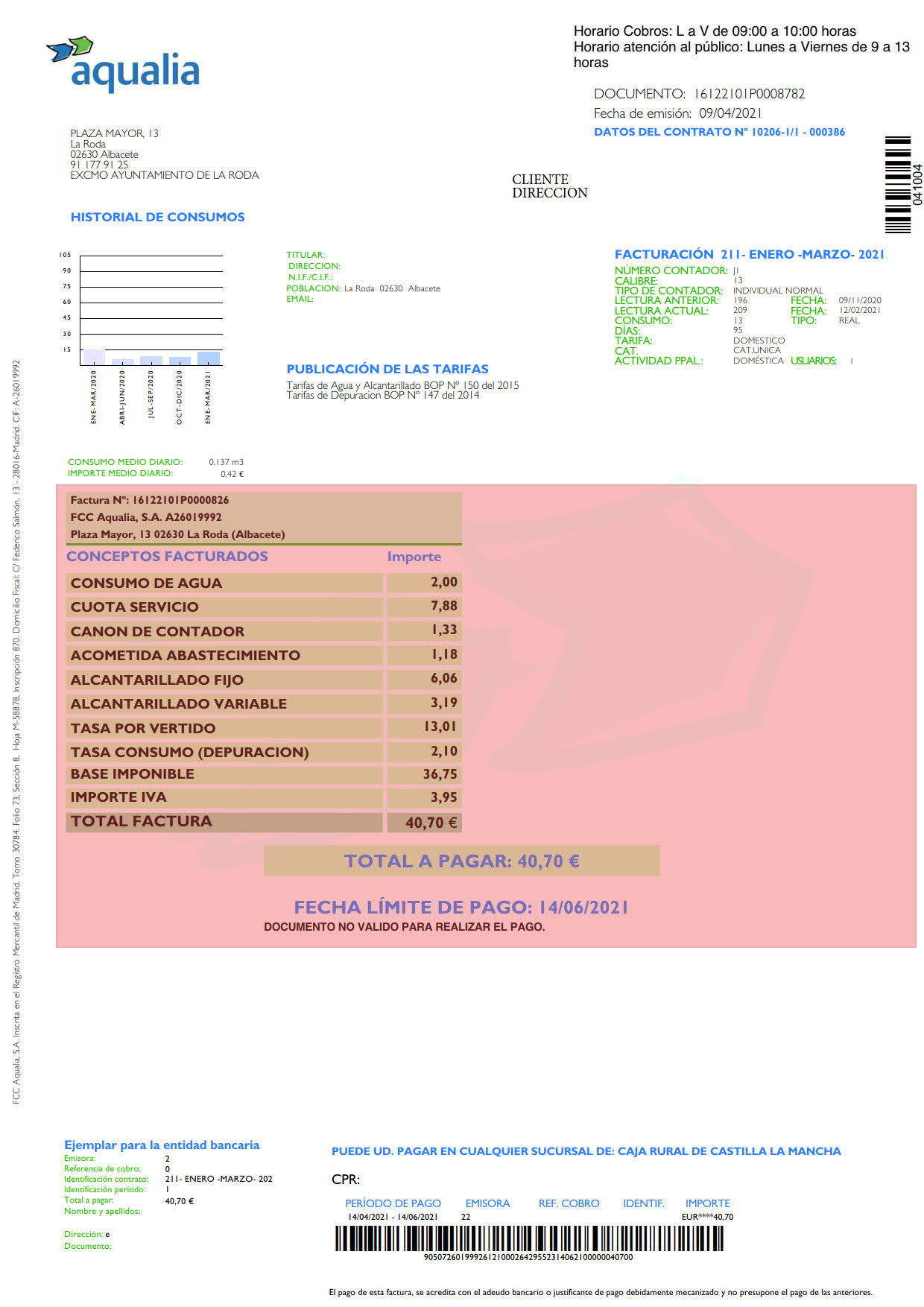 El conjunto de procesos y recursos (captación del agua en el medio ambiente, su transformación en agua potable, la distribución a su domicilio y su devolución a la naturaleza) que hacen posible que usted disponga de agua de calidad, comprenden toda una serie de factores que aparecen reflejados en la factura a través de sus distintos conceptos (agua, saneamiento, depuración, etc).