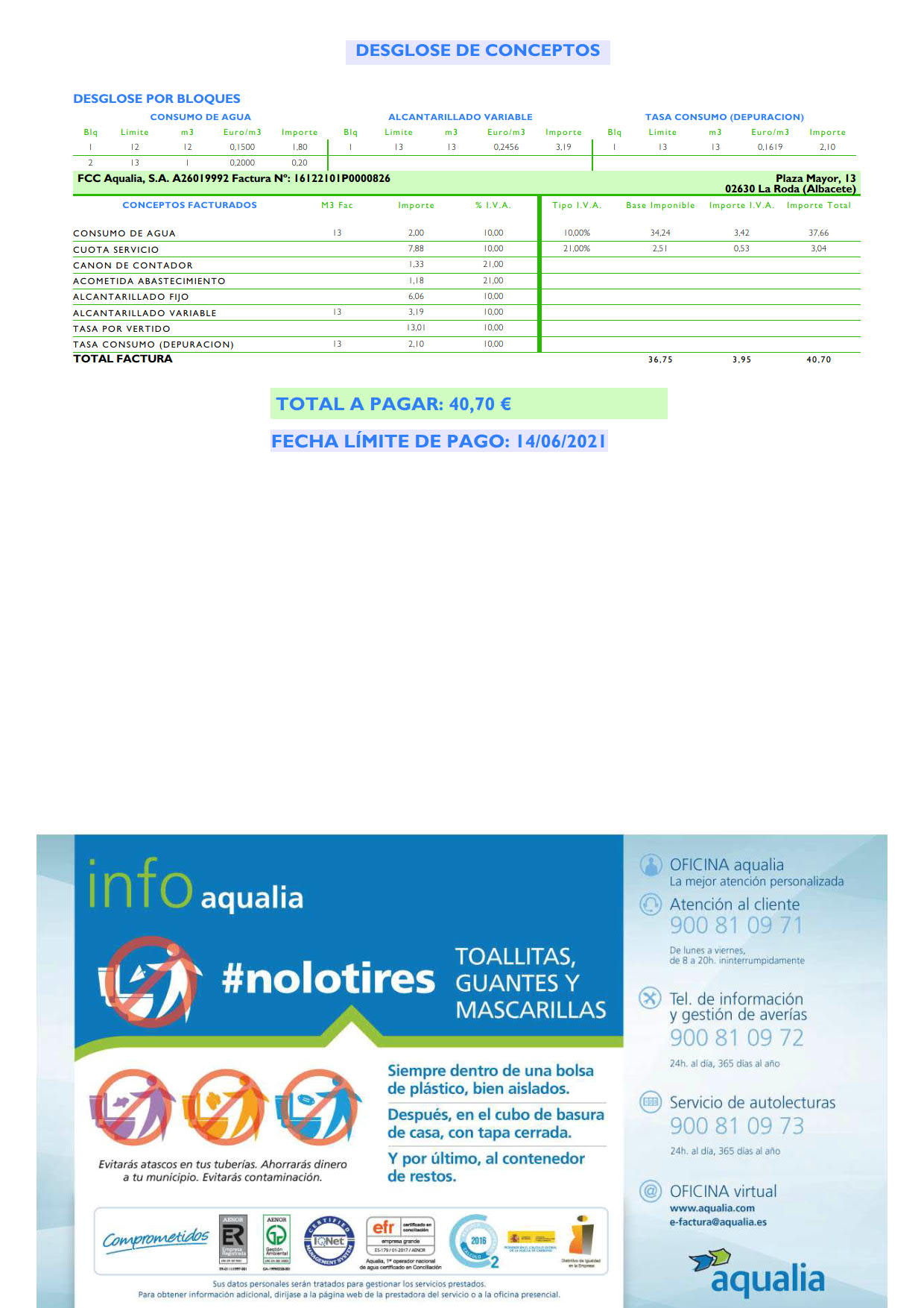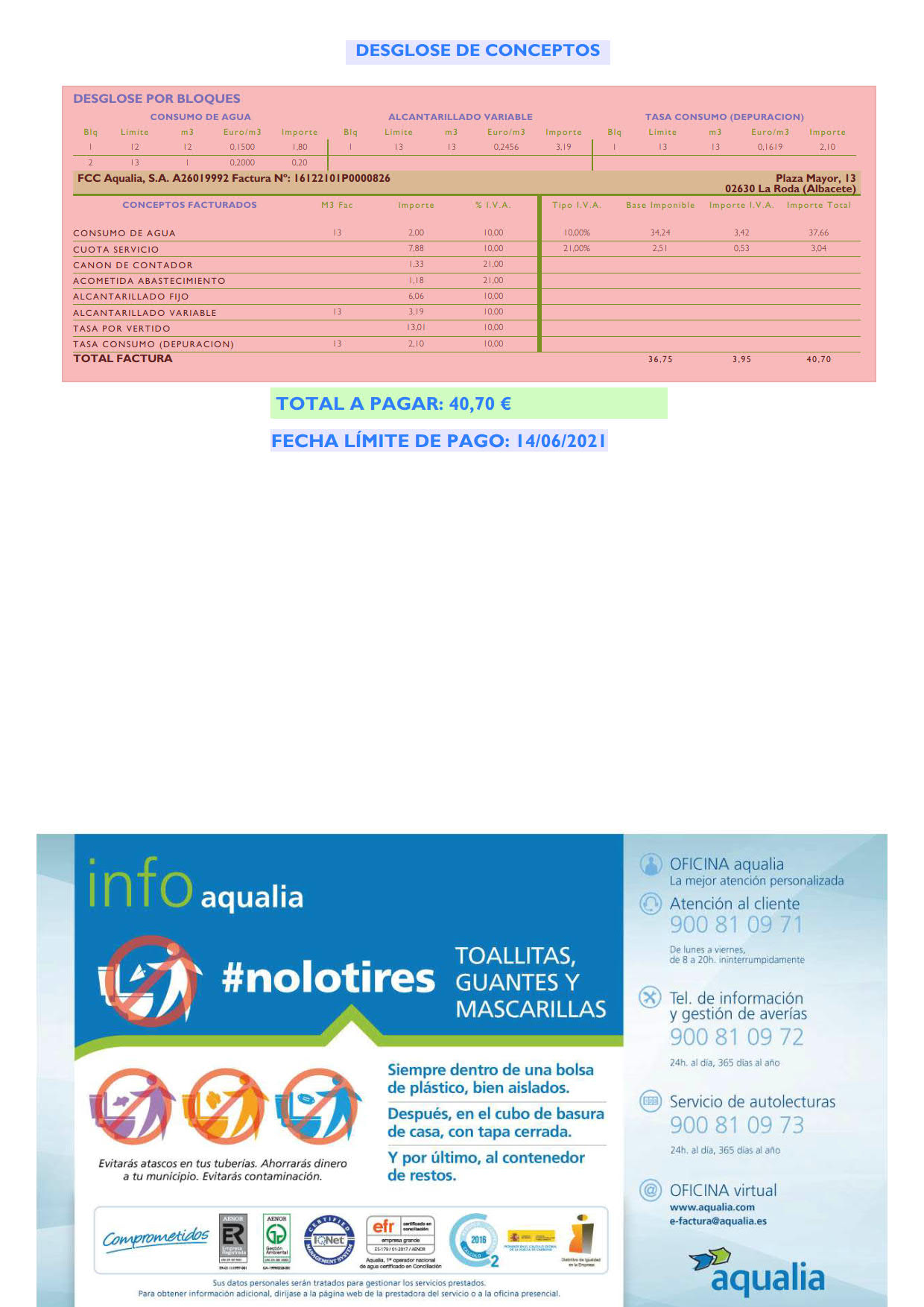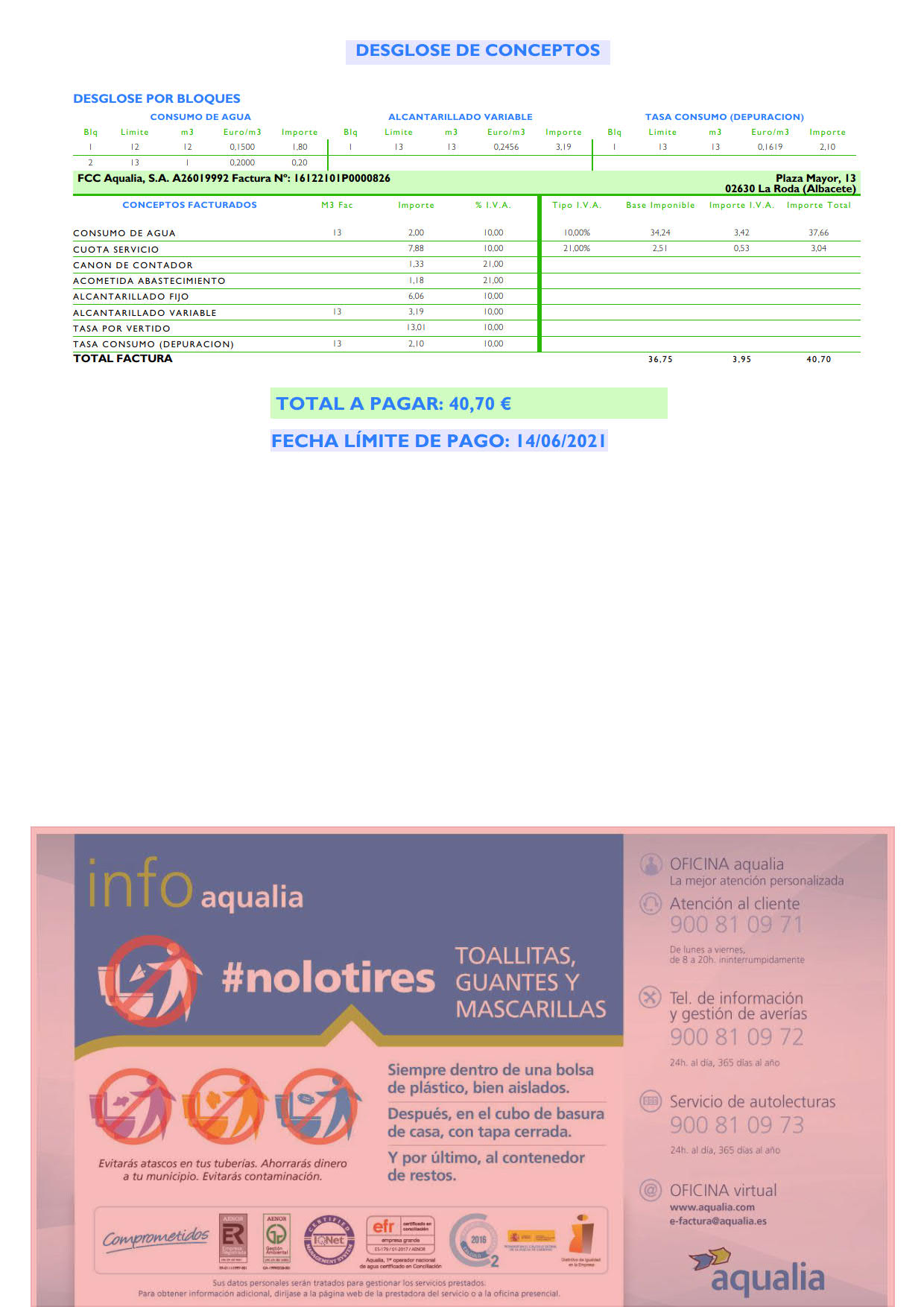 En el reverso de la factura conocerá de manera detallada y desglosada como se han facturado el abastecimiento, el saneamiento y la recogida de basuras, así como los datos identificativos de la facturación que le serán de utilidad cuando contacte con nosotros.