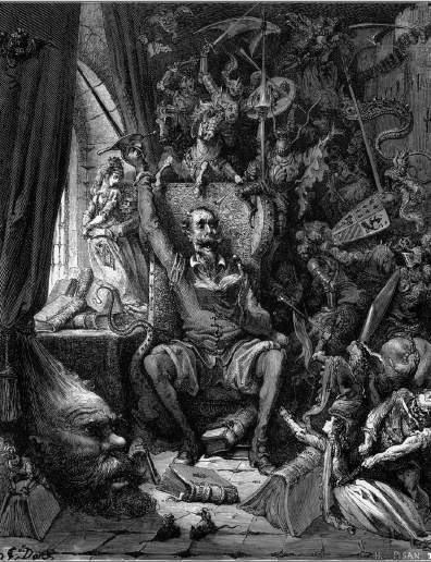 Gustave Doré es uno de los mejores ilustradores de El Quijote. No en vano, Doré hizo por España un largo viaje para inspirarse directamente en los lugares cervantinos. La demencia o locura de nuestro entrañable caballero, es precisamente uno de los aspectos que Doré más y mejor se propuso recalcar en su tarea de ilustrar la obra.