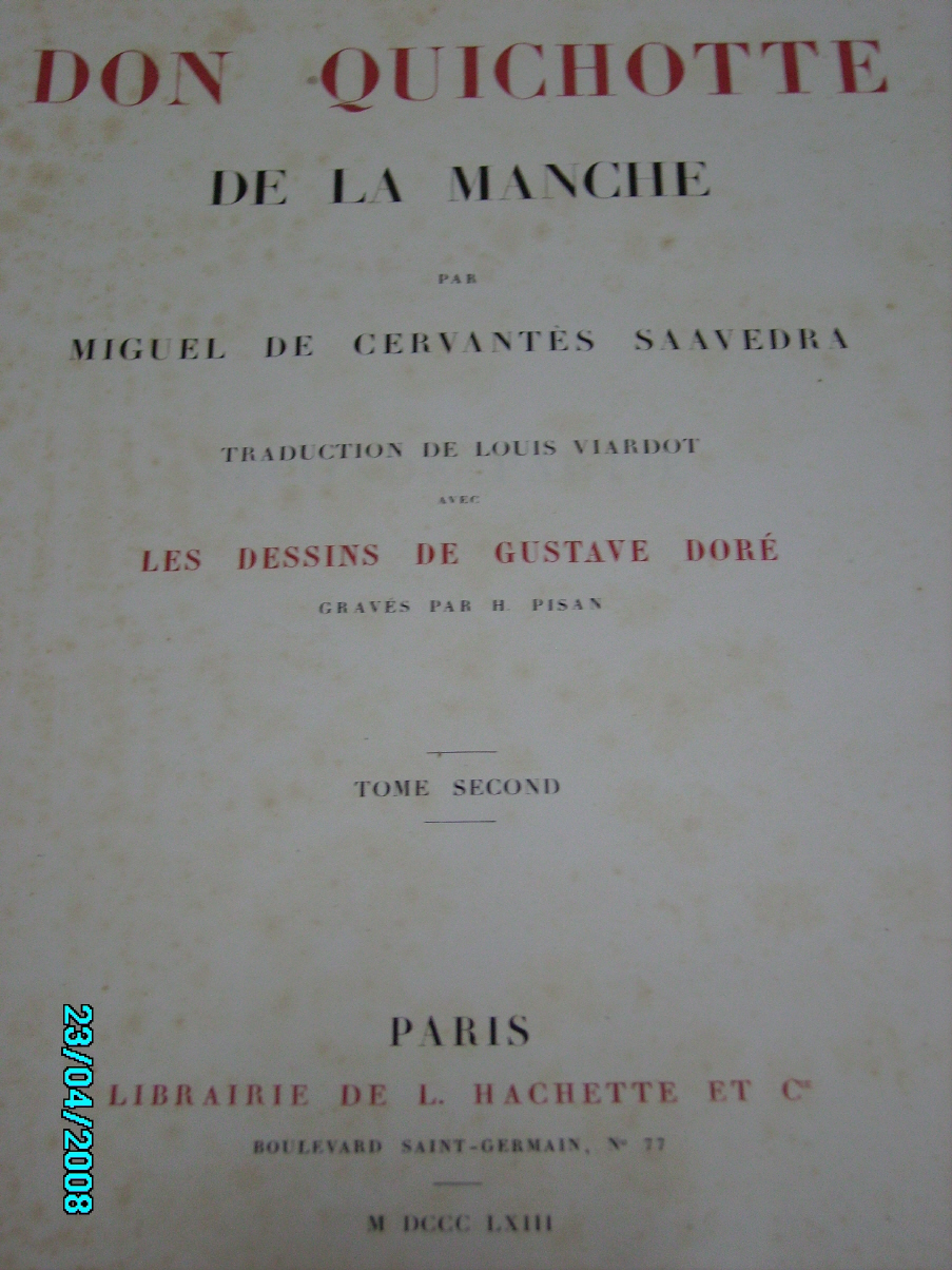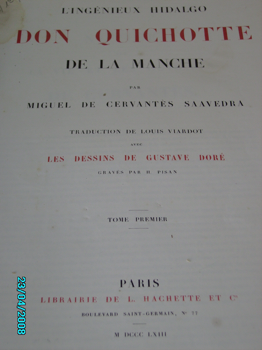 La edición que aquí mostramos lleva como título: L’ingénieux hidalgo Don Quichotte de La Manche. Traducción de Louis Viardot, con dibujos de GUSTAVE DORÉ grabados por H. Pisan. Tomo primero y segundo. París, libreria de L. Hachette et Cie. 1863. Con una introducción de Louis Viardot sobre la vida y obras de Cervantes. Cuenta con 370 ilustraciones de Gustave Doré, la mayoría de ellos en gran formato.