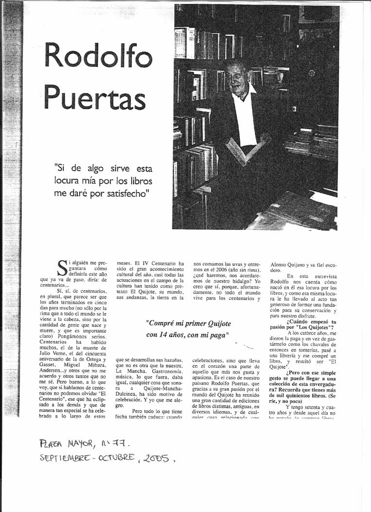 RODOLFO PUERTAS: SI DE ALGO SIRVE ESTA LOCURA MIA POR LOS LIBROS ME DARÉ POR SATISFECHO Compré mi primer Quijote a los 14 años. Plaza Mayor, ( periódico de La Roda) Septiembre-Octubre de 2005.